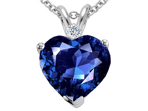 Created Sapphire and Genuine Diamond Heart Pendant crafted in 14 kt White Gold Dimensions: 14 mm long x 8 mm wide.1 Stone 2.00 Carats Heart Shape 8mm. Color: Blue Clarity: Clean, 1 Stone 0.02 Carats Round Diamonds Color: I Clarity: SI Free 18 inches 14kt gold chain included. - FREE LIFETIME WARRANTY, GIFT BAG AND GIFT CARD!. Our Style Number 25405